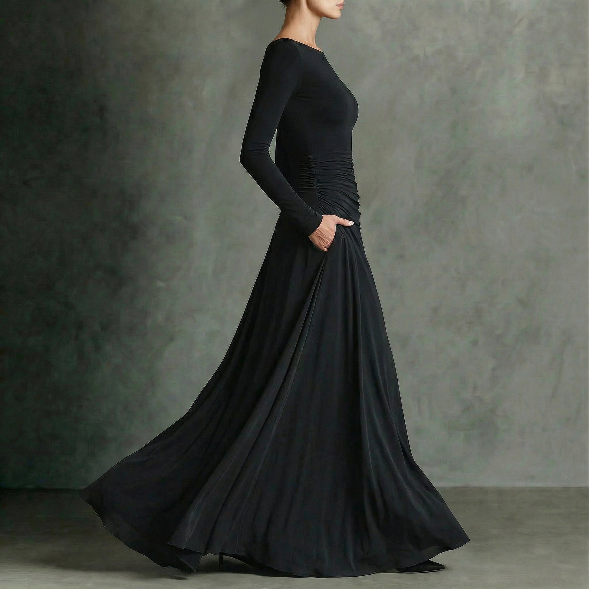 Cette robe longue noire se distingue par sa silhouette sophistiquée et son tombé fluide qui accompagne chaque mouvement avec élégance. Le design à manches longues et encolure bateau offre un équilibre parfait entre sensualité et raffinement, en faisant une pièce intemporelle indispensable dans toute garde-robe féminine.